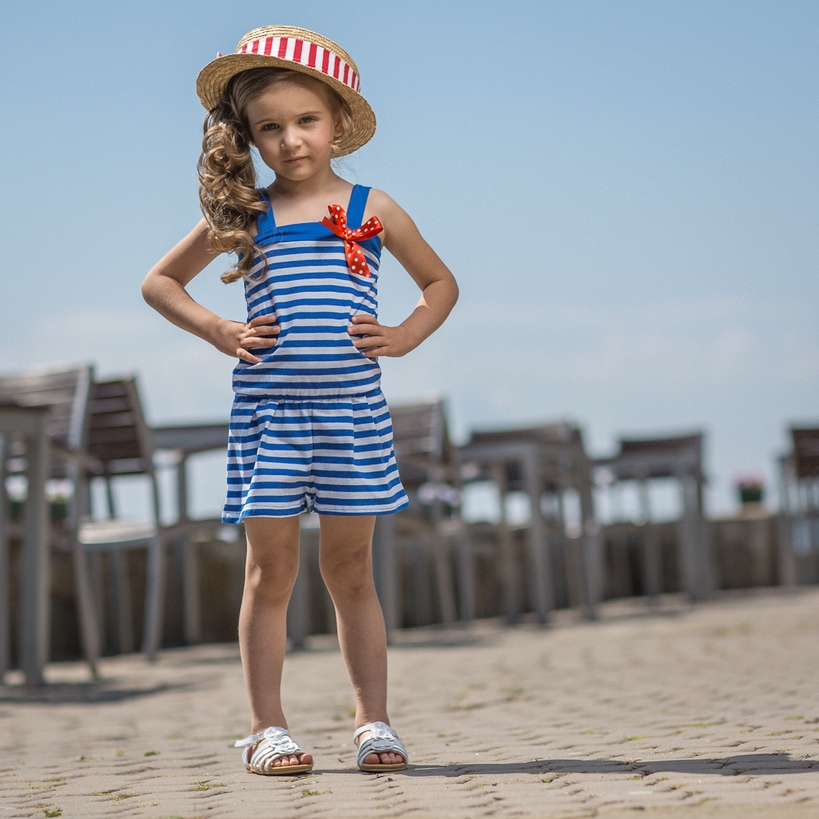 Детский летний комбинезон для девочки включает в себя: красивую маечку и юбку-шорты. Лекала модели продуманы так, чтобы комбинезон красиво сидел на любой девочке разной комплекции. Для этого у него есть резинка посередине, а впереди: украшение, красный бант в горошек из атласной ткани.