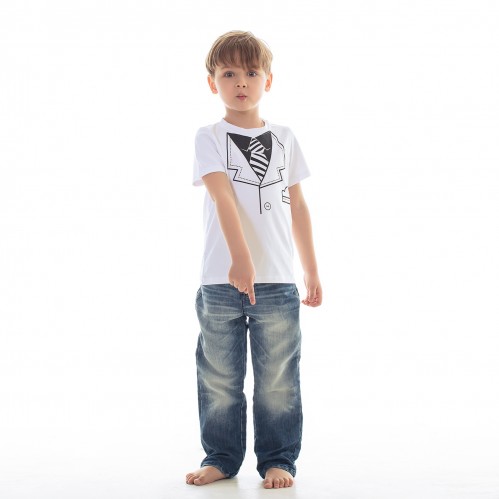 В этой забавной футболке мальчик выглядит как маленький денди. Комфортная футболка классического белого цвета отлично заменит мешковатые рубашки и "галстуки-удавки", которые приходится одевать мальчику во время утренников в детском саду.