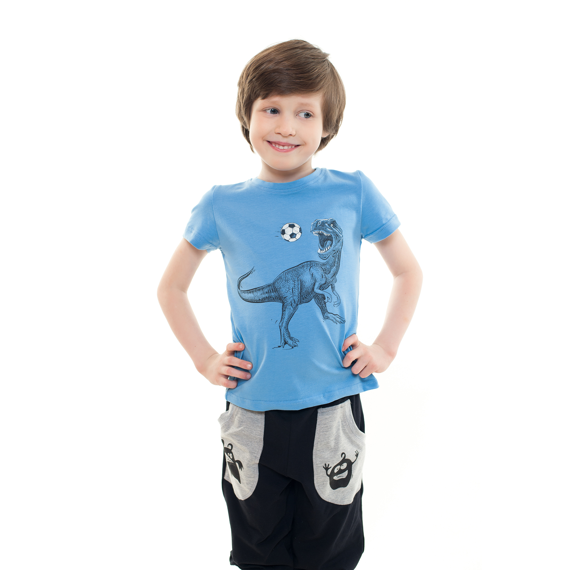 Рисунок динозавра-футболиста - это точное попадание в то, что хотят большинство мальчиков на своей одежде. Это и спортивно и весело. Футболка выполнена в двух цветах.