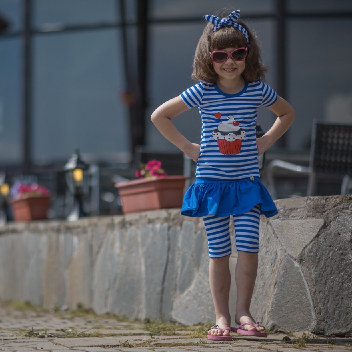 Девочкам в этом возрасте нравится кататься на качелях, скатываться с горки, бегать, прыгать, веселиться. Чтобы это было им в два раза удобнее, мы создали такую модель, в котором и юбка и короткие лосины соединены. На юбочке есть милый аксессуар - декоративные часики