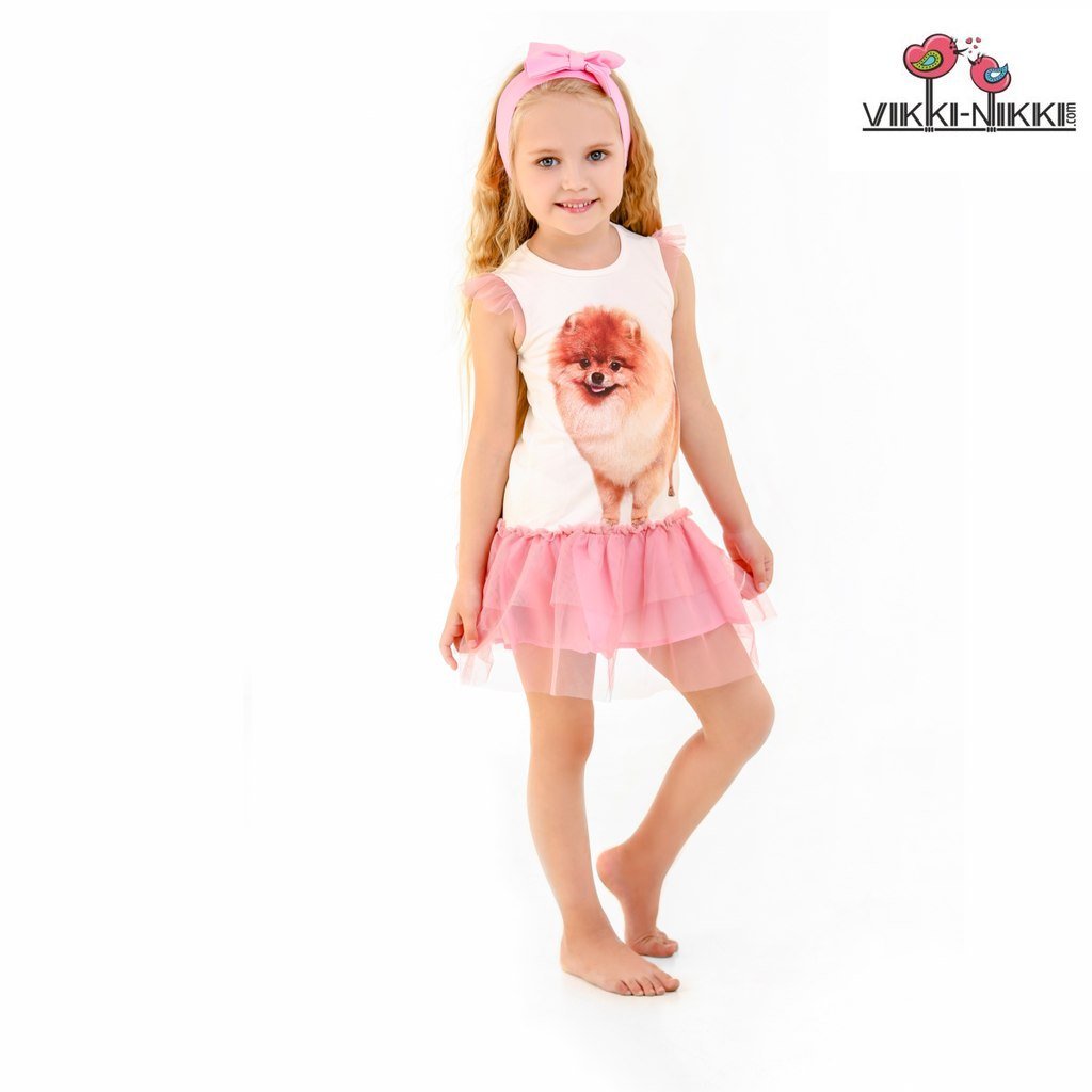 Рисунок на платье выполнен методом шелкографии. Это экологичный и самый стойкий способ нанесения рисунка, он остается ярким даже после ста стирок. Юбка и "крылышки" на рукавах из розовой сетки. Молочное платье в стиле "мимими"